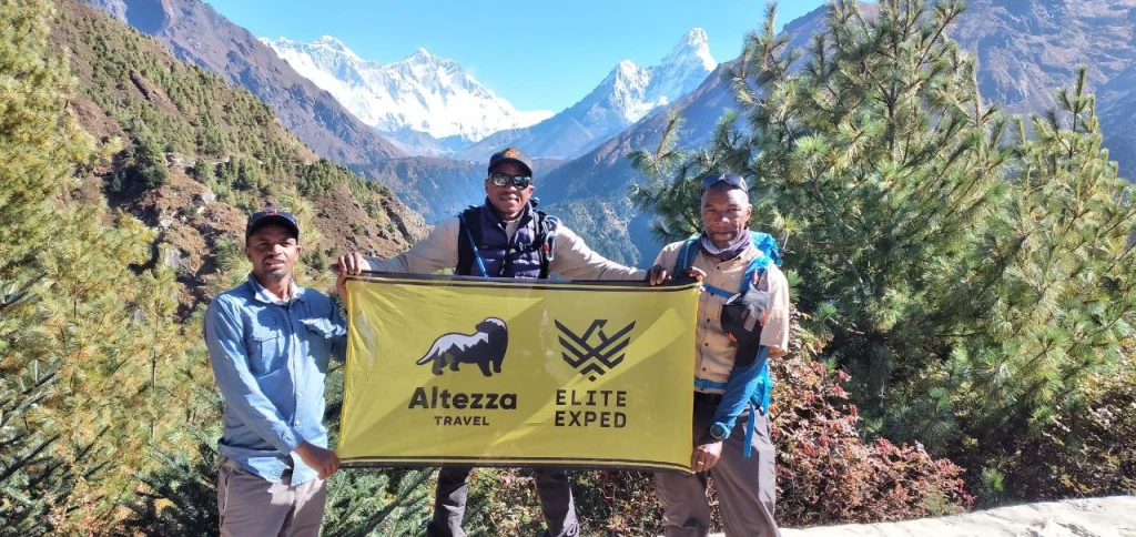 A finales de octubre de 2023, Altezza Travel preparó a nuestros guías para su viaje a Nepal. Joshua, Abraham y Victor, equipados con todo el material necesario, se disponían a realizar su primer viaje al extranjero. La empresa se encargó de sus billetes de avión y seguros. Tras un largo vuelo de más de 20 horas, llegaron sanos y salvos a Katmandú, donde se encontraron con sus colegas nepalíes. Desde allí tomaron un helicóptero hacia Lukla.